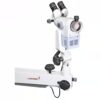 Kolposkop mit ergonomischem neigbaren Binokulartubus und 10x Okularen (WF 10X / 18mm) mit faltbaren Augenschutz, Dioptrieneinstellung ± 5 mm. Integrierter 5-stufiger Vergrößerungswechsler ((2,3x; 3,4x; 5,7x; 9,1x und 14,2x). Das Kolposkop ist ausgestattet mit einem 300 mm Objektiv mit zusätzlichem manuellen Fokus. Als Beleuchtung dient eine moderne 27W LED (5700 K, über 75.000 Lux). Der eingebaute zuschaltbare Grünfilter sorgt für bessere Kontraste. Das komplette System wird auf einem stabilem, rollbarem Bodenstativ ausgeliefert.
